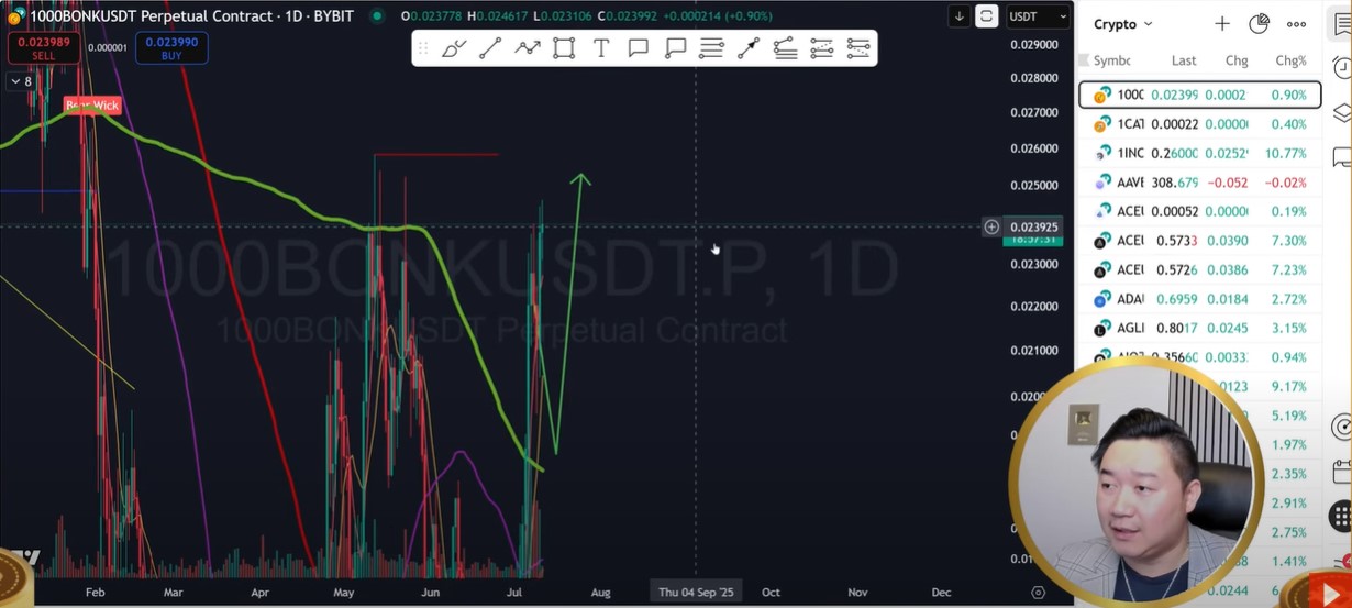 - BONK đã đi đúng với phân tích trước đó, rớt về vùng gần 0.0188 USD (thực tế chạm 0.0196 USD) và sau đó bật tăng.