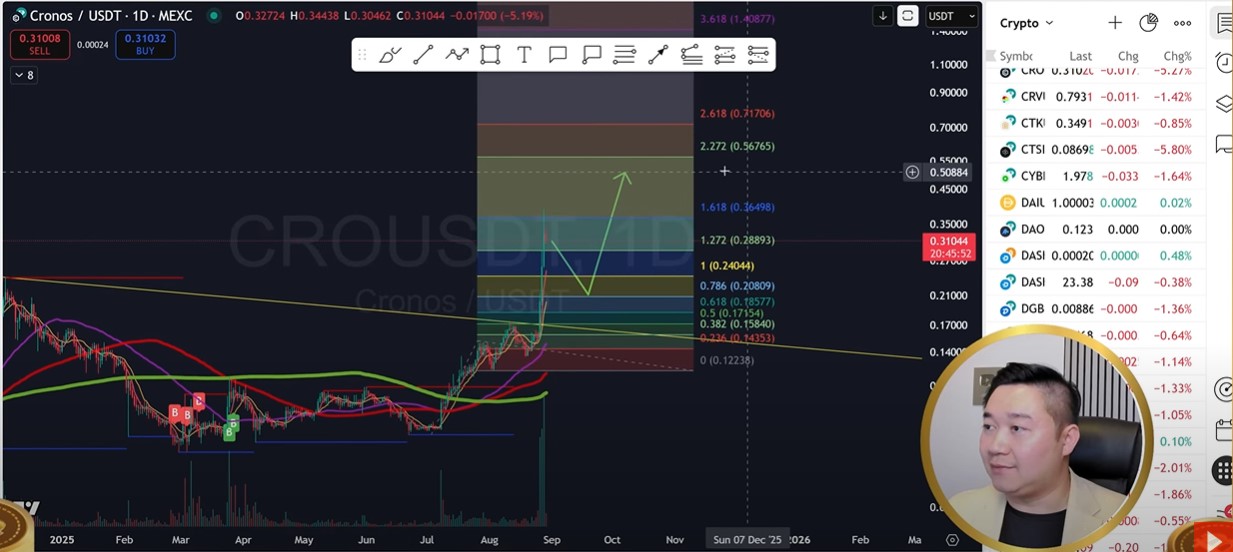 - CRO đã breakout và đạt tới các mức key level theo Fibonacci extension, sau đó xuất hiện sự rejected.