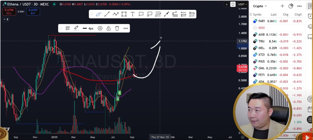 - ENA đã đi khá đúng với kỳ vọng trước đó: tạo double bottom, bật lên nhưng chỉ đạt 0.77 USD thay vì target 1 USD.