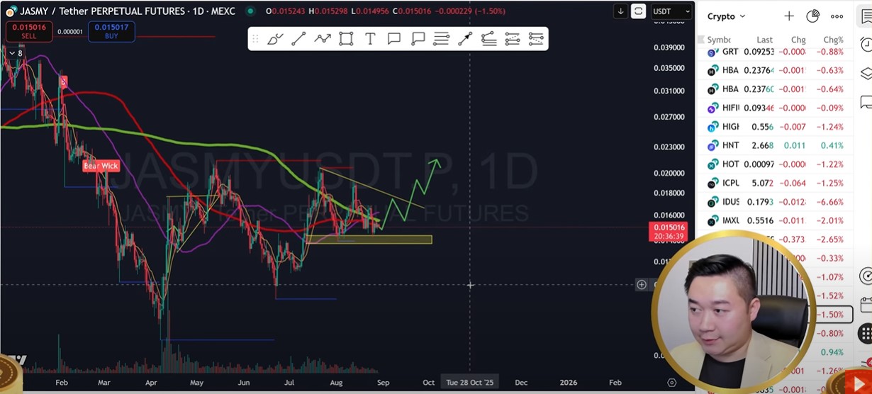 - Nên chờ JASMY dip nhẹ một nhịp (về khoảng 0.0148 USD) rồi mới mua sẽ an toàn hơn.
