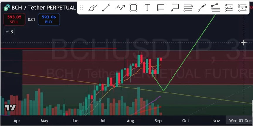 • BCH đã rớt về 525 USD thay vì 485 USD như kịch bản trước, sau đó bật mạnh lên 593 USD.