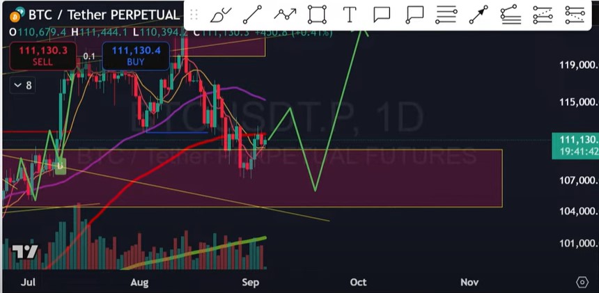 • Nếu gặp kháng cự tại SMA50, có thể dip nhẹ về 107,000 USD để tạo mô hình double bottom.