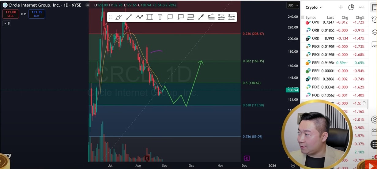 - CRCL trước đó Mậu kỳ vọng bounce từ 142 USD rồi lên, nhưng thực tế chỉ bật lên 144 USD rồi tiếp tục rớt, chưa đi đúng kỳ vọng ban đầu.