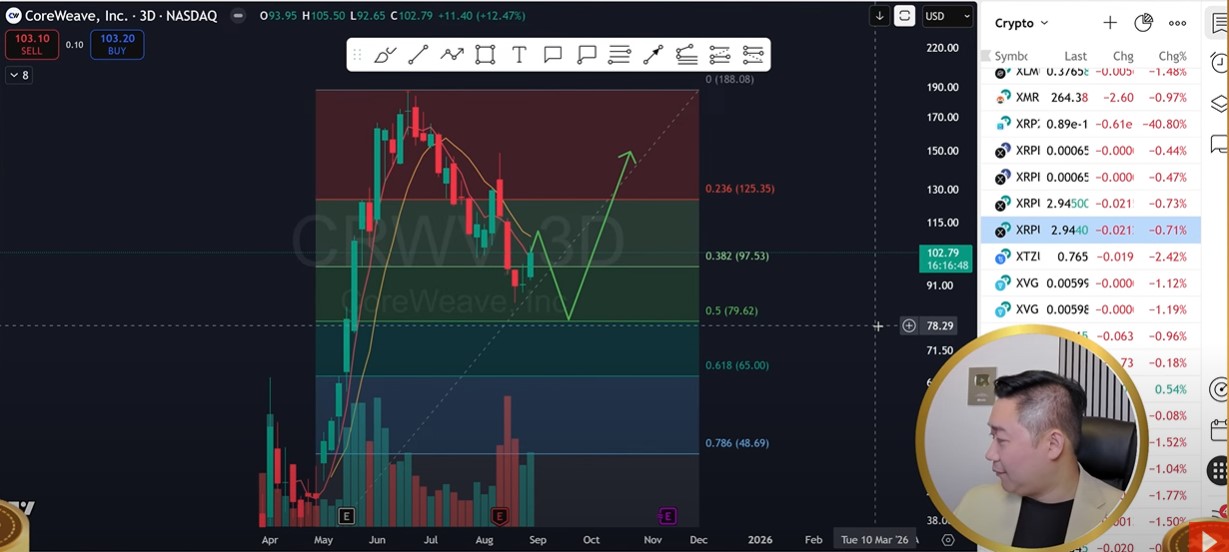 - CRWV đã đi sai nhịp dự đoán trước: thay vì bật lên trước rồi mới rớt, nó rớt thẳng về 85 USD (thấp hơn target 80 USD một chút) rồi bật lên lại.