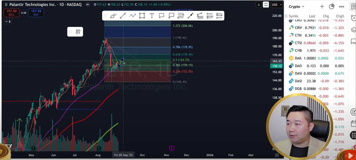 - PLTR đã đi đúng phân tích trước: từ 177 USD bounce nhẹ rồi rớt xuống, vượt cả target 160 USD và chạm 142 USD.