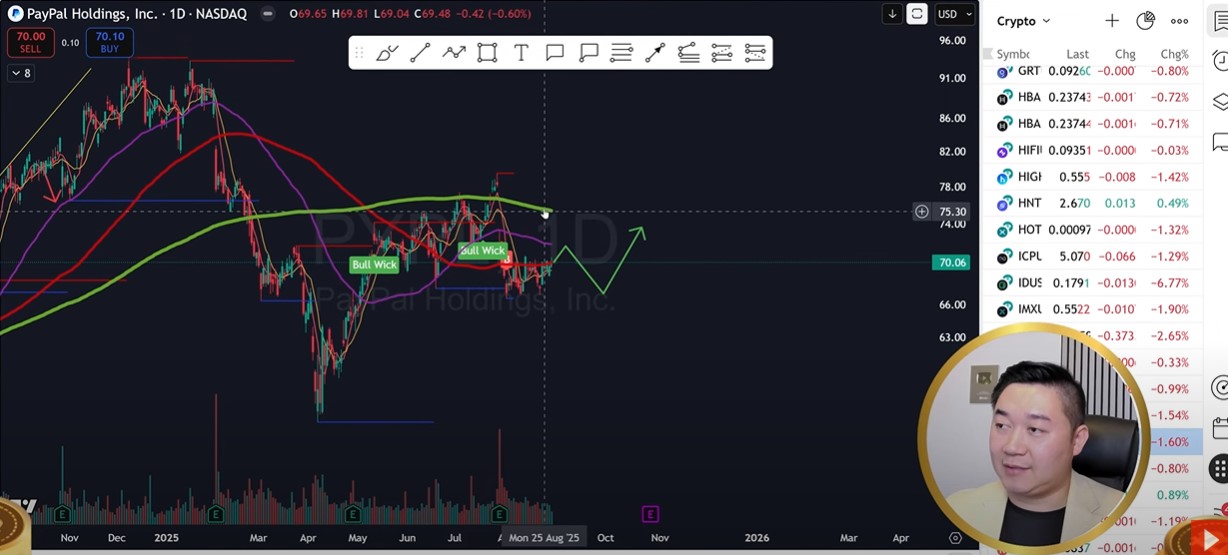 - Trên khung ngày, PayPal đang trong trạng thái khó coi, chart “bèo”, thiếu tín hiệu rõ ràng để xác nhận đà tăng mạnh.