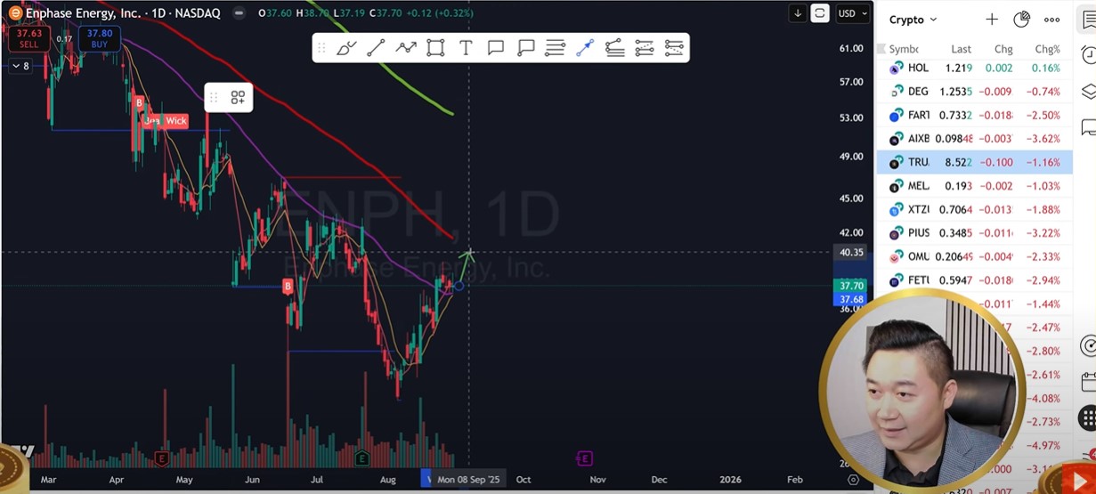 - ENPH đã đi đúng dự đoán trước đó: từ 35.93 USD về 34.35 USD (gần với mốc 33.97 USD kỳ vọng), sau đó bật mạnh lên trên 40 USD.