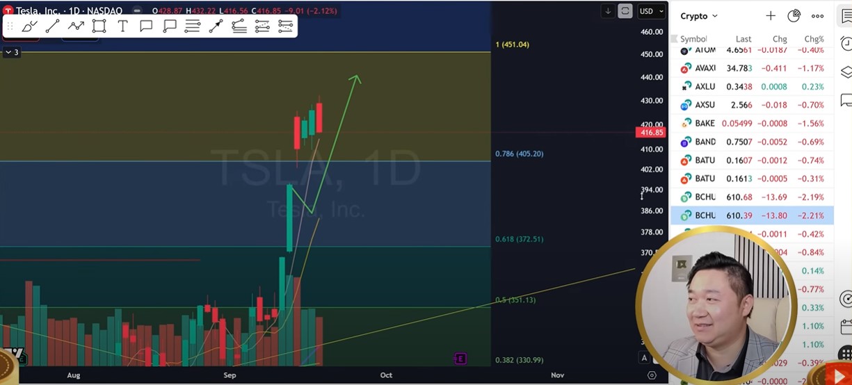 - Expect đẩy nhẹ lên 423 USD, sau đó dip mạnh về 382 USD.